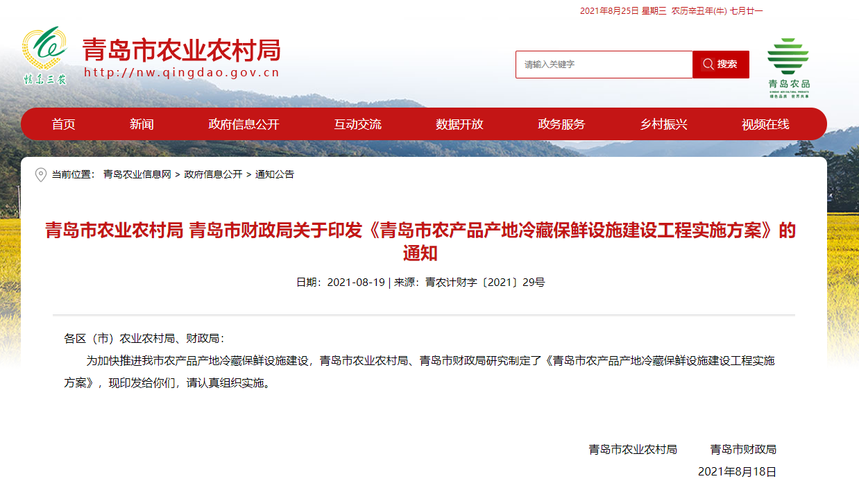 預(yù)冷及配套設(shè)施設(shè)備。根據(jù)產(chǎn)品特性、市場(chǎng)發(fā)展和儲(chǔ)運(yùn)加工的實(shí)際需要,規(guī)模較大的設(shè)施,可配套建設(shè)強(qiáng)制通風(fēng)預(yù)冷、差壓預(yù)冷或真空預(yù)冷等預(yù)冷庫(kù)或預(yù)冷設(shè)施,配備必要的稱量、清洗、分級(jí)、檢測(cè)、信息采集等設(shè)備以及新建貯藏設(shè)施專用的供配電設(shè)備。農(nóng)產(chǎn)品產(chǎn)地冷藏保鮮設(shè)施建設(shè)規(guī)模在500噸以上的,要將信息采集監(jiān)測(cè)傳輸視頻設(shè)備與青島市農(nóng)業(yè)農(nóng)村大數(shù)據(jù)平臺(tái)互聯(lián)互通。