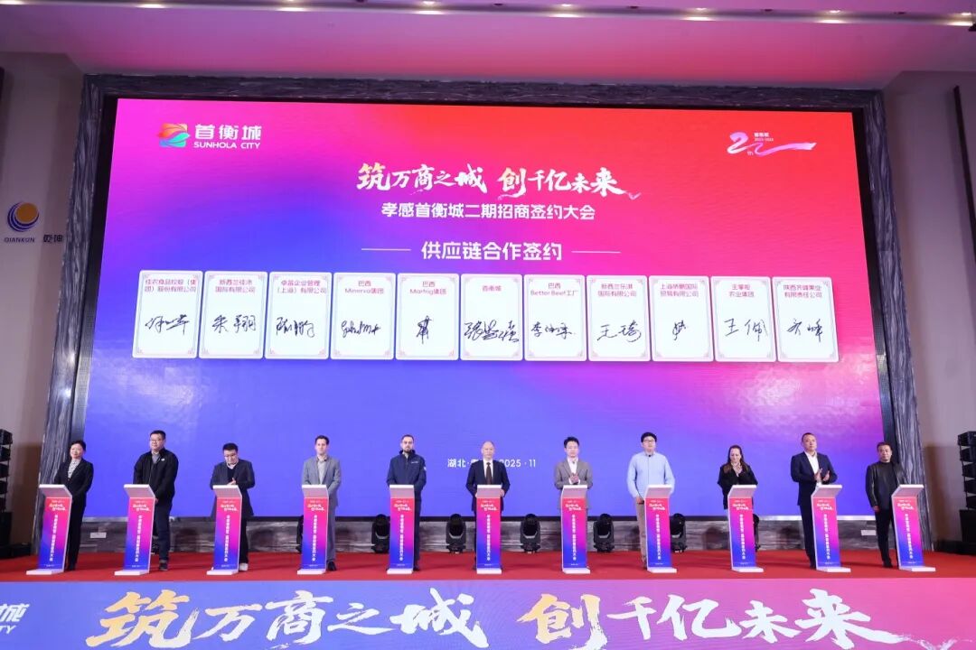 11月28日,“筑萬商之城 創千億未來——孝感首衡城二期招商簽約大會”在湖北孝感舉行。首衡集團副總裁張曉強代表集團登臺,分別與佳農、新西蘭佳沛、新西蘭樂淇、卓莓等知名企業,以及巴西Marfrig集團、巴西 Minerva 集團、巴西Better Beef工廠等國際供應鏈伙伴集中簽署合作協議。此次簽約陣容涵蓋果蔬、肉類等多個品類的全球領軍品牌,既是孝感首衡城吸引力的直接彰顯,更是首衡集團深度踐行國內國際雙循環與全國統一大市場國家戰略的生動實踐,為打通國內外農產品雙循環通道、構建高水平對外開放格局注入強勁動能。