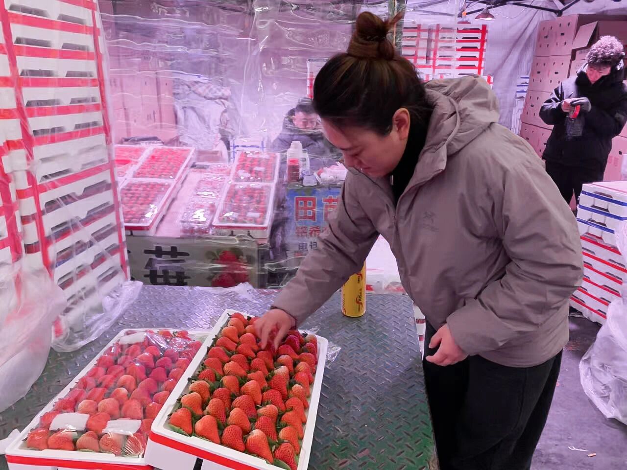 “眼下正值草莓銷售旺季,日銷量一天比一天高,臨近春節,我們每天兩車新鮮到貨,基本當天就能售罄,根本不愁賣!”檔口負責人田苗一邊麻利地給草莓封膜,一邊笑著說道,眉眼間滿是實干的勁頭。