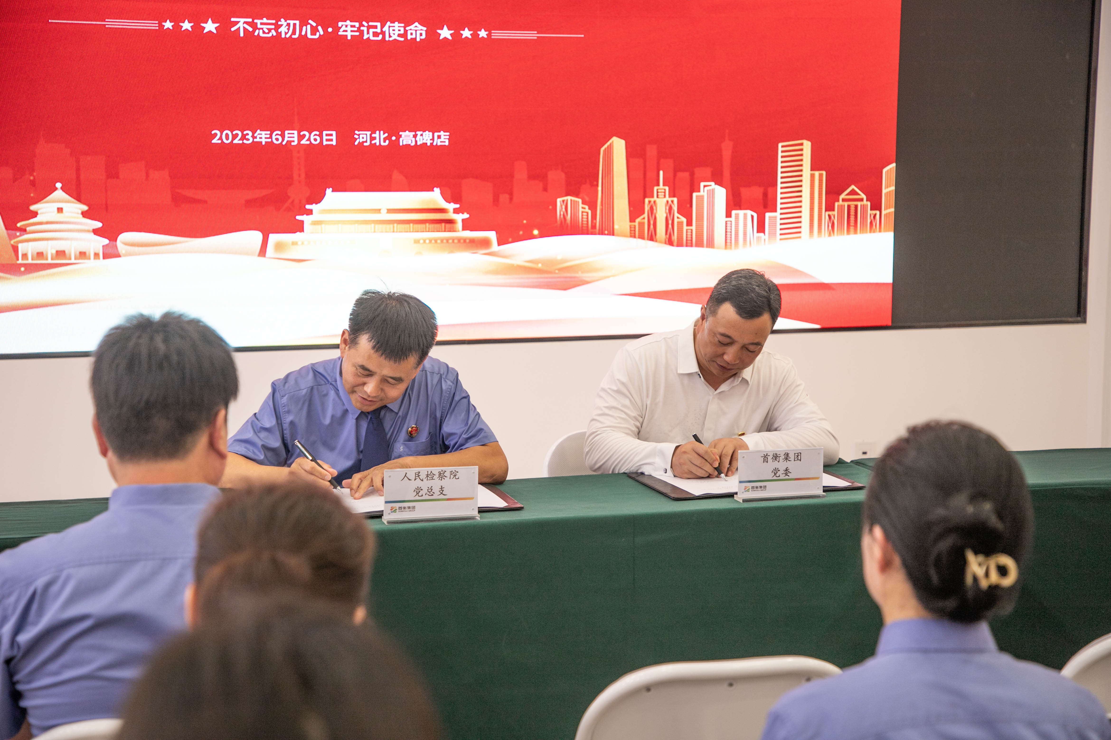 為深入學習貫徹習近平新時代中國特色社會主義思想和黨的二十大精神,落實新時代黨的建設總要求,促進檢企合力共建,在中國共產黨102周年華誕即將到來之際,6月26日下午,首衡集團黨委和高碑店市人民檢察院黨總支開展“檢企連心聚合力,黨建引領促發展”為主題的黨建共建簽約儀式。首衡集團黨委書記、總裁魏樹儉和高碑店市檢察院黨組書記、檢察長王進文出席儀式,來自兩個黨組織的30余名黨員和首衡集團審計監察中心相關負責人共同參加活動。